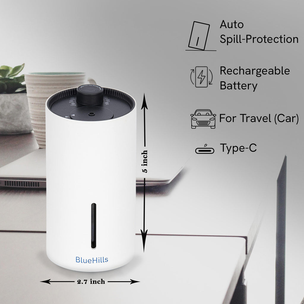 BlueHills Waterless diffusers give you the option of saturating any room with the untouched quality aroma of essential oils without using water. We chose cold diffusion technology to transform essential oils into micro-fine vapor or particles as small as 1-3 microns without the need for heat or water. Instead, essential oil is dispersed into the air as extremely tiny particles emitted by a diffuser. When fully charged, this nebulizer aroma diffuser produces an intermittent mist for a long time. An elegant and smart way to create a calming ambiance in your kids' room, kitchen, living area, home, car or office. In addition, it is a portable diffuser, which is one of the needed car travel essentials. This cordless diffuser is a great way to add soothing fragrance to any space. This Mini White Diffuser’s minimalistic style allows it to blend into any décor and is suited for large rooms or any space. The Diffuser blends aromatherapy with home décor. You can use it as a room diffuser or as a decorative accessory. This battery powered rechargeable diffuser is designed to create a calm and soothing environment.