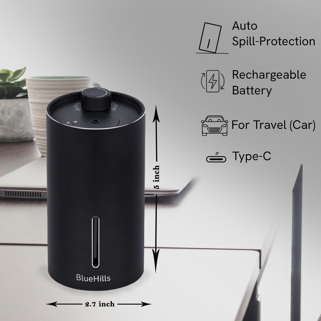 BlueHills Waterless diffusers give you the option of saturating any room with the untouched quality aroma of essential oils without using water. We chose cold diffusion technology to transform essential oils into micro-fine vapor or particles as small as 1-3 microns without the need for heat or water. Instead, essential oil is dispersed into the air as extremely tiny particles emitted by a diffuser. When fully charged, this nebulizer aroma diffuser produces an intermittent mist for a long time. An elegant and smart way to create a calming ambiance in your kids' room, kitchen, living area, home, car or office. In addition, it is a portable diffuser, which is one of the needed car travel essentials. This cordless diffuser is a great way to add soothing fragrance to any space. This Mini Black Diffuser’s minimalistic style allows it to blend into any décor and is suited for large rooms or any space. The Diffuser blends aromatherapy with home décor. You can use it as a room diffuser or as a decorative accessory. This battery powered rechargeable diffuser is designed to create a calm and soothing environment.